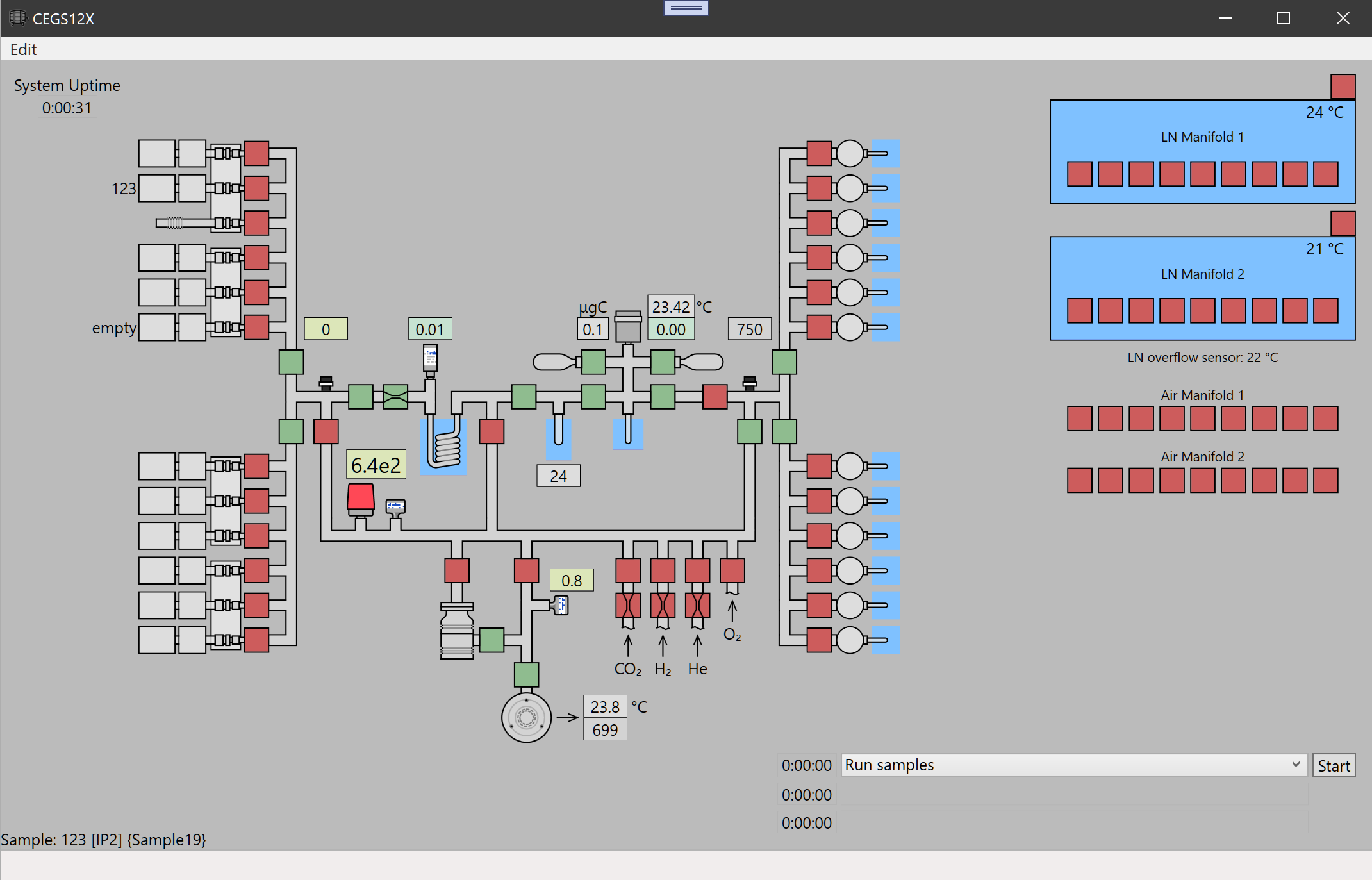 The user can individually control most system elements via the graphical user interface, which resembles a schematic diagram. For example, they could close or open a valve, or adjust the digital filter for a pressure sensor. See User Interface for a brief introduction to the user interface.